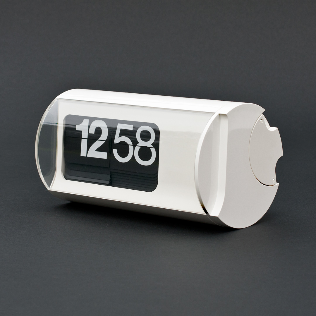As well as the collective vision systems, Fermo asks Valle to design a version for office life: thus Cifra 5 is born, originator of the series and Compasso d’Oro award in 1956. Ten years later, with Cifra 3, Valle creates the smallest clock of the series: the cylinder on which the flaps revolve becomes the axis of the whole design. Massimo Vignelli, Valle’s brother-in-law, takes care of the lettering, developing different typefaces for hours and minutes and adjusting the Helvetica font via slight optical changes. The result is a wonder of function and aesthetics, capable of giving life to an evergreen icon and overcome a novel challenge: channeling the flux of time, and transforming an indistinct rhythm into a masterpiece of complex simplicity.