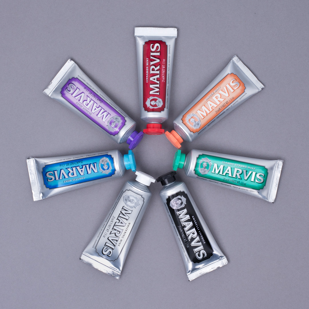 White teeth have always been thought the hallmark of vigor and good health: the Egyptians, the Greek and the Romans come up with the first toothpowders, from a flower, resin, and abrasive substances base. Recipes multiply thereafter. Most are homemade remedies mixed with burnt bread, coal or ground-down bricks. We have to wait until the end of the nineteenth-century to get a real and proper revolution: in 1893, when doctor Washington Sheffield makes the first paste in a squeezable tube (up until then you could only buy toothpaste or toothpowder in glass jars). A few years later Colgate starts large-scale selling, taking charge of the global market. Toothpaste in a tube arrives in Italy with American soldiers, immediately entering the post-war lifestyle: the economic boom drives several pharmacies to whip up new recipes that enhance people’s smiles. The Marvis formula arrives in the 50s, among various others: a toothpaste in an elegant, metallic tube. The Florentine company Ludovico Martelli, est. 1908 as a distributor of eau de cologne and producer of beauty creams, takes ownership over in the 90s, adding to a new mint-flavored aesthetic to smiles. Today the company is in its fourth generation, and continues in its traditional production, combining dentifrice paste in seven different and brightly colored flavors. A contemporary rainbow that, starting from Italy, has spread across the world to become an icon of style in oral care.